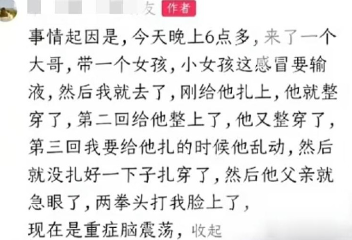 女护士又过来给孩子扎第三针,可能是因为孩子和家长的一系列动作让她很紧张,这第三针可没有前两次顺利,第三针是她自己给孩子扎穿了。这时候,女孩的父亲发怒了,二话不说,直接就打了女护士两拳。